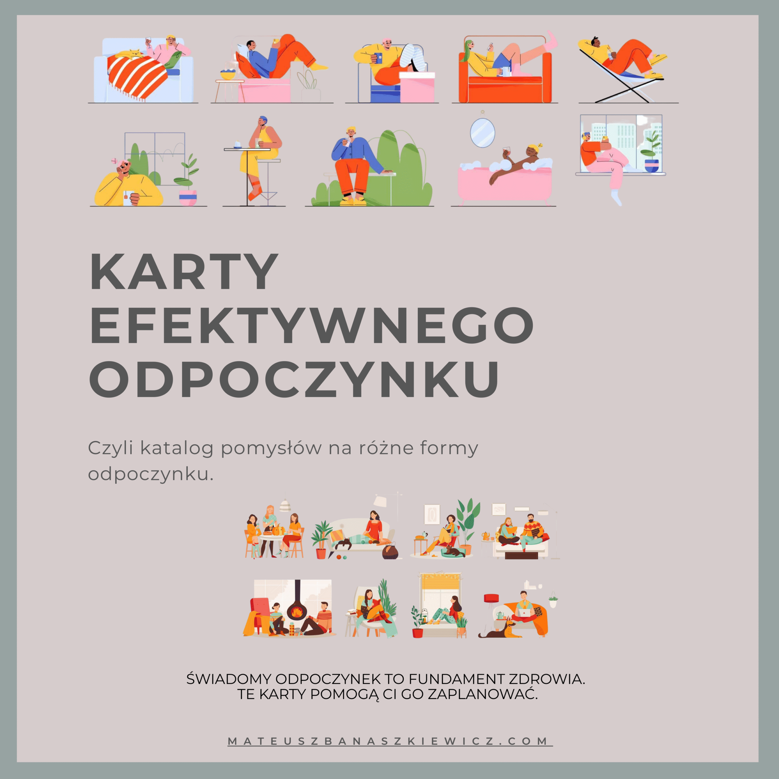 To nie jest kolejna książka do czytania. To karty z listą pomysłów na odpoczynek, które możesz wykorzystać od razu. Zebrałem w jednym miejscu inspiracje na różne formy regeneracji: krótkie mikro-praktyki i dłuższe aktywności, które pomogą Ci naładować baterie w zwykły tydzień i podczas urlopu.